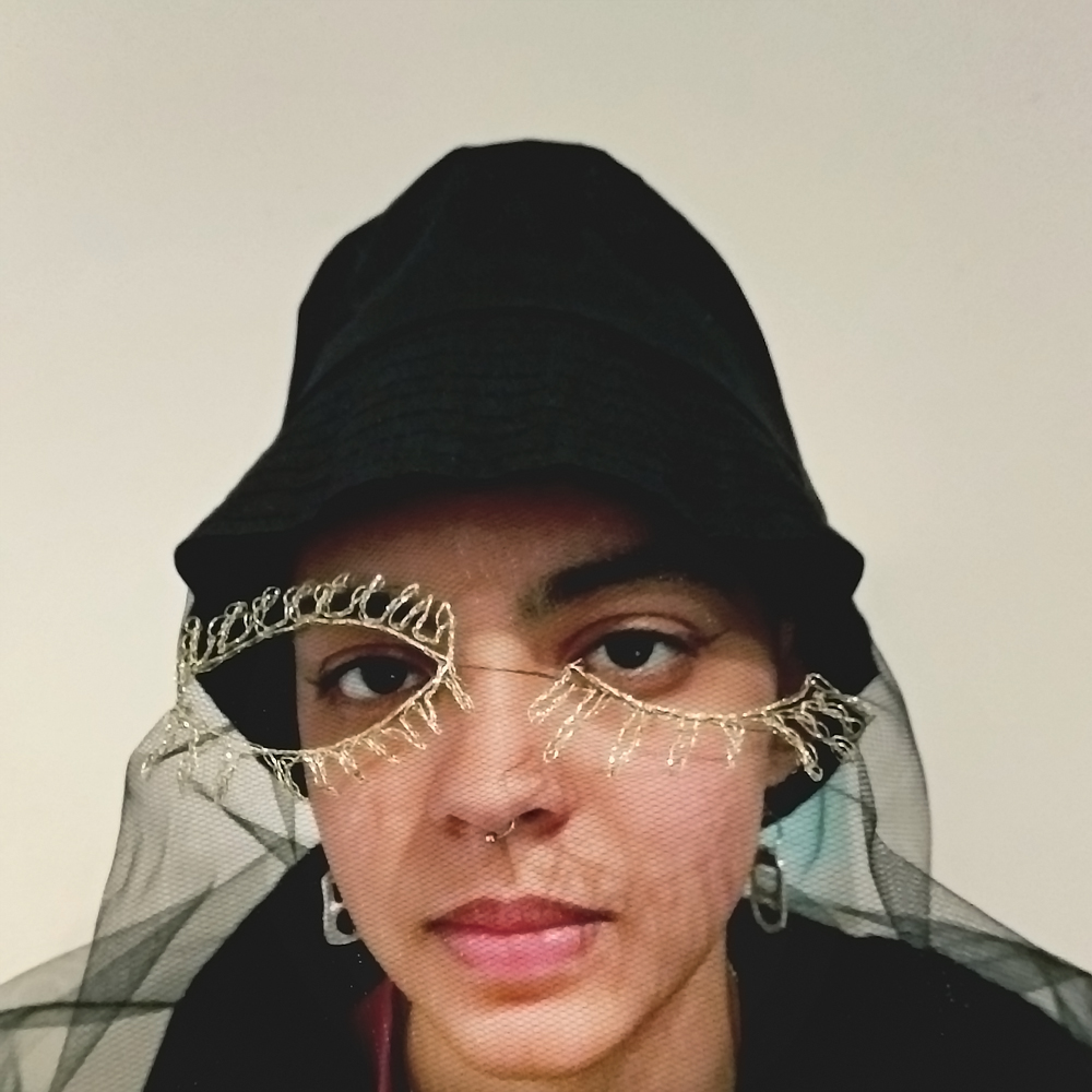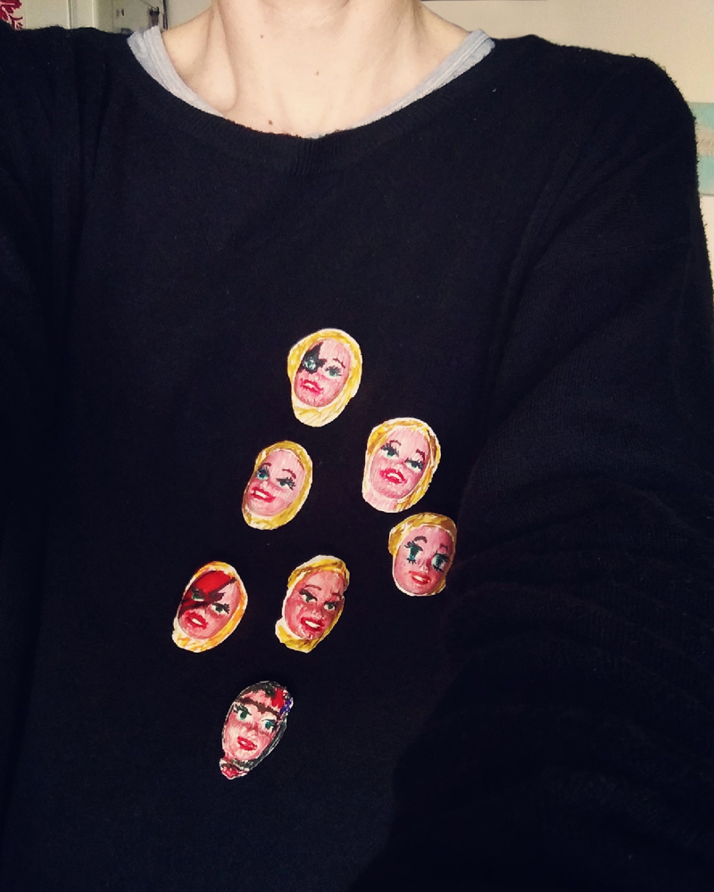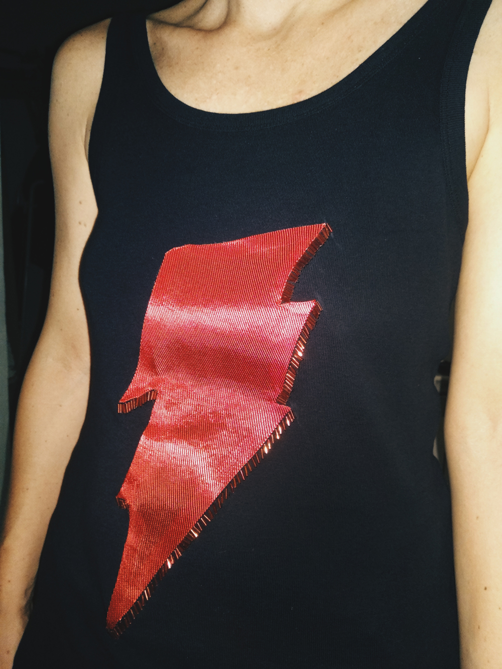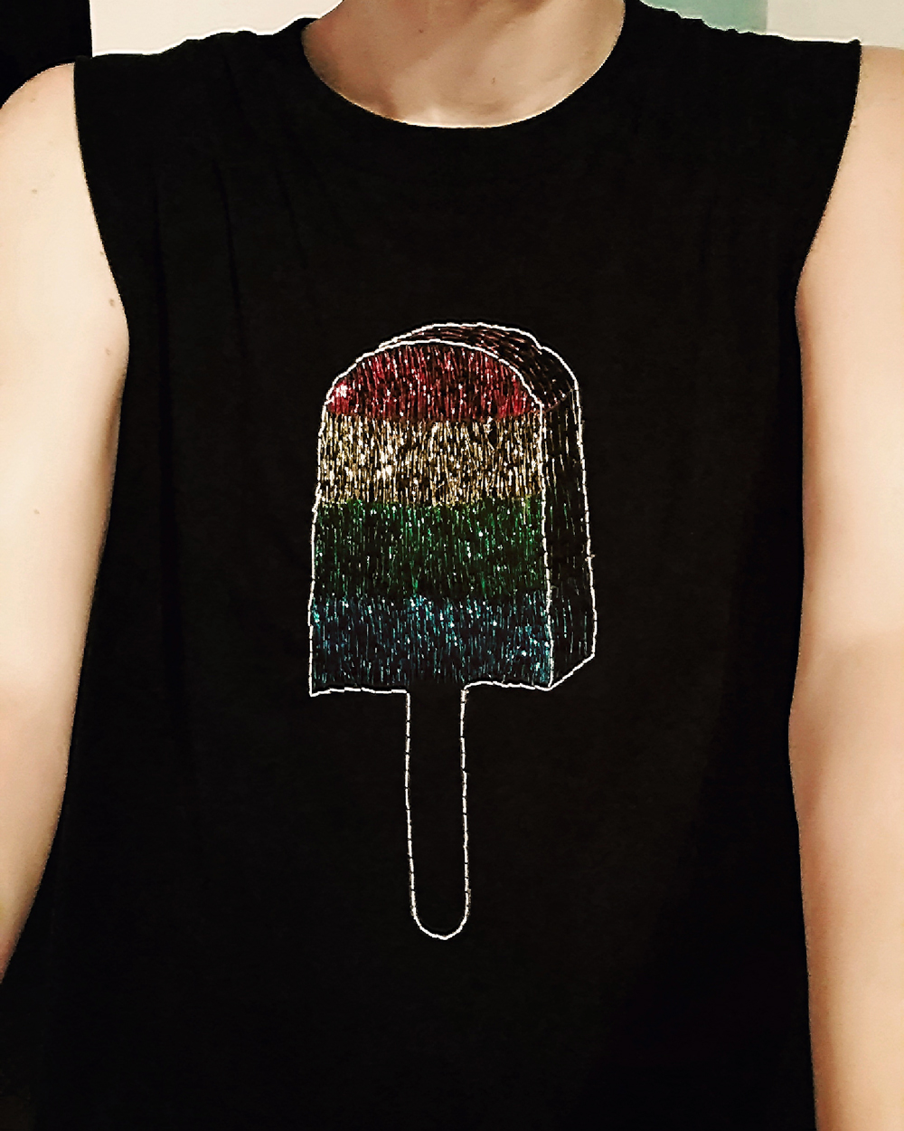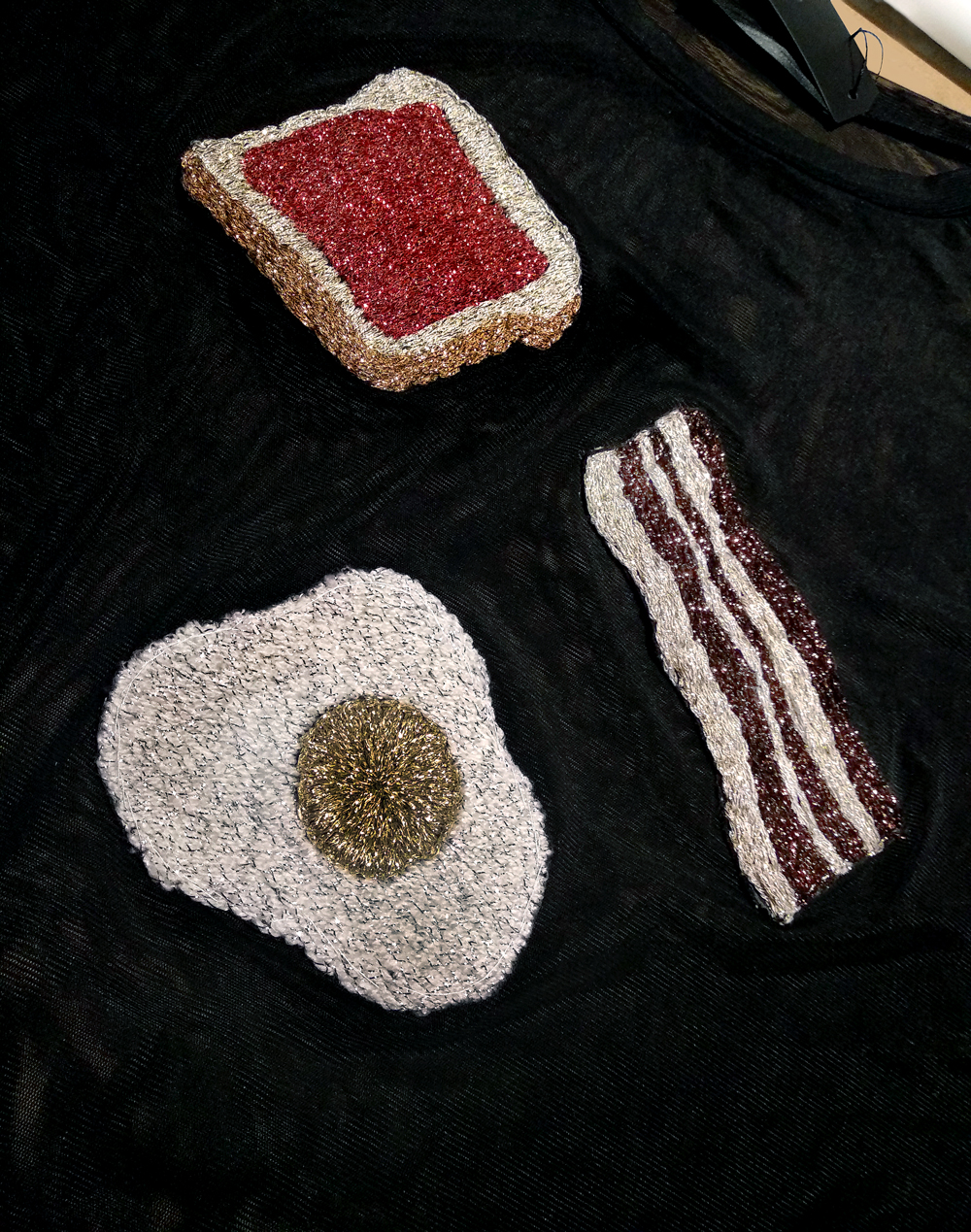•  canottiera con applicazione patch uovo lurex oro argento ricamato a mano